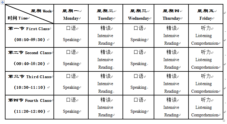 课表示例(以入门级汉语课程为例)