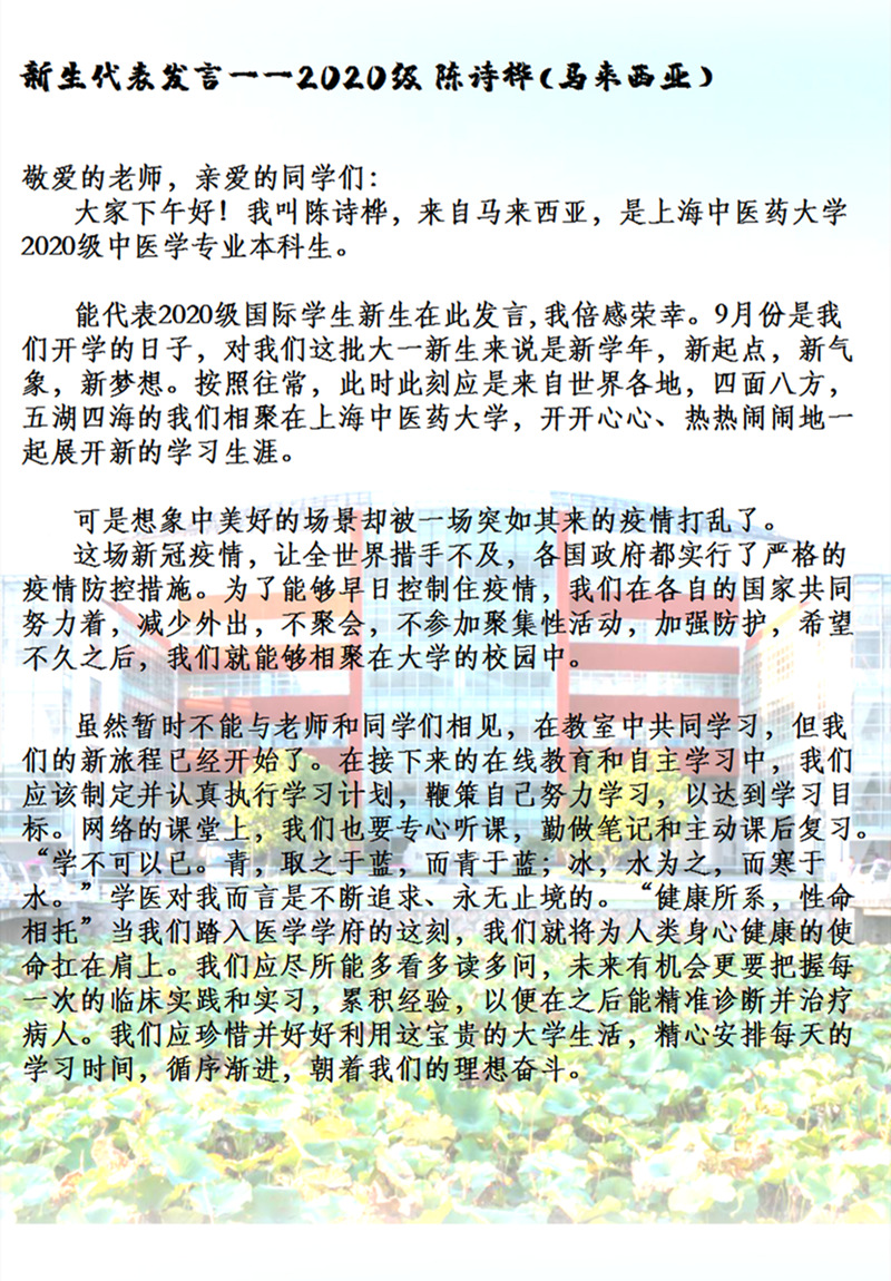 新生代表发言-2020级·陈诗桦(马来西亚)