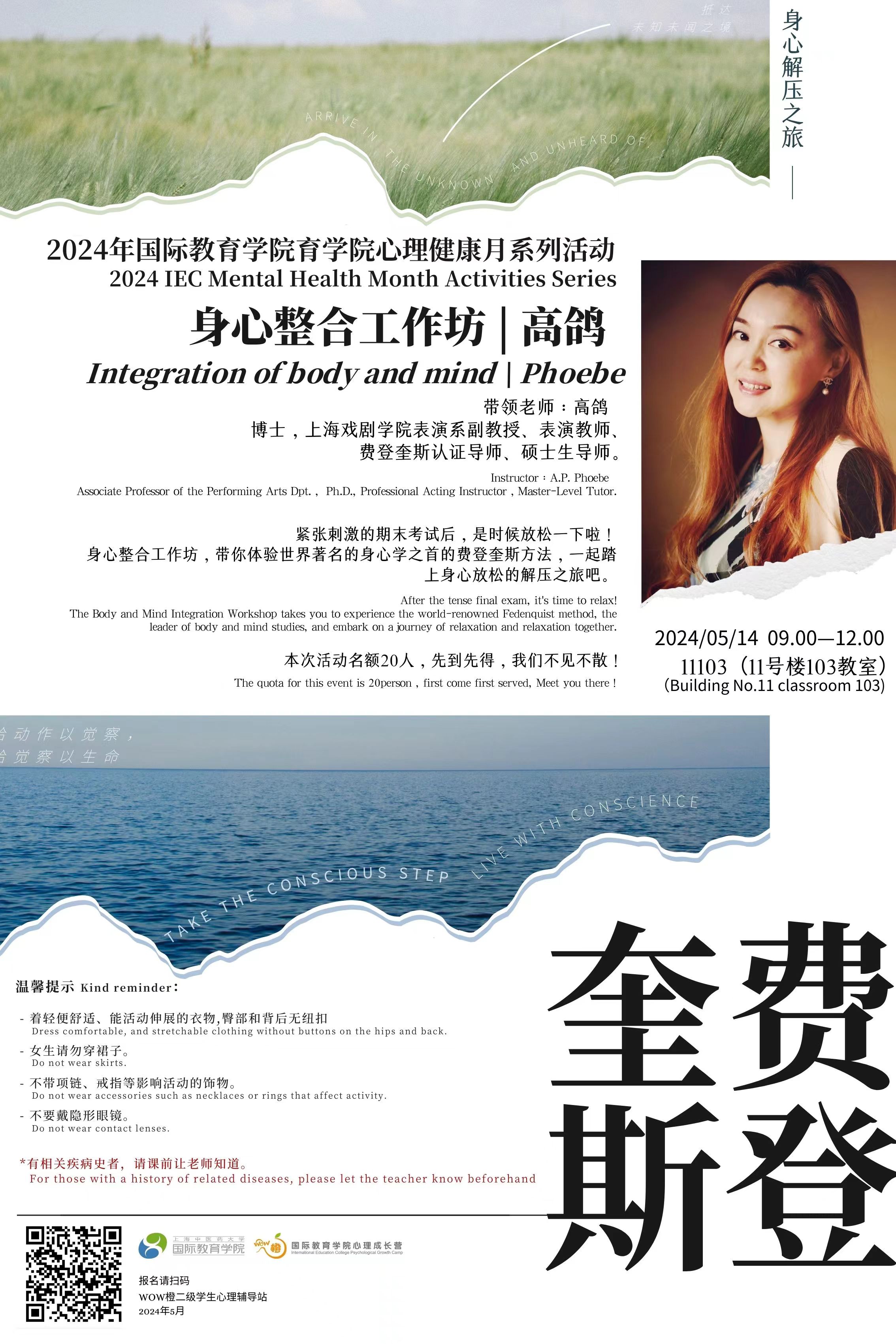 2024年5月14日上午,国际教育学院”WOW橙”二级心理辅导站特邀上海戏剧学院表演系副教授、表演教师、费登奎斯认证导师高鸽老师,在11103教室带领24名师生共同探索身心整合的奥秘。