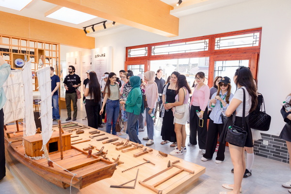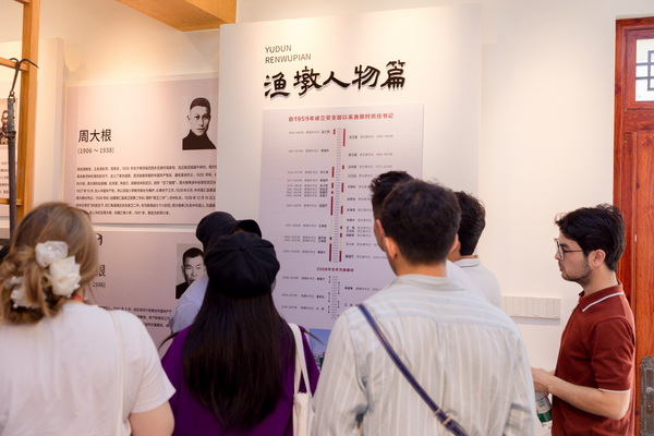 活动首站来到奉贤区四团镇渔墩村,留学生们在村史馆中聆听百年渔村与中医文化交融的故事。馆内陈列的船舶标本、古代蓑衣令留学生们驻足并在老师带领下复习经典诗句“孤舟蓑笠翁、独钓寒江雪”。
