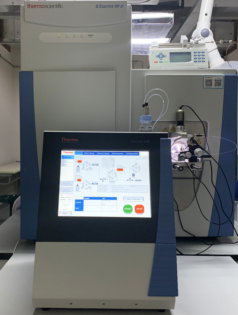 主要技术指标:质量数范围:50-6000 m/z;质量准确度:内标:<1 ppm, RMS; 外标:< 3 ppm, RMS;灵敏度:全扫描 MS:100 fg 上柱量利血平 S/N 为150:1;SIM扫描:50 fg 上柱量利血平 S/N 为150:1;分辨率:240000 @m/z 200;最大扫描速度:40 Hz。仪器配有EASY-nLC 1200 纳升级液相色谱。