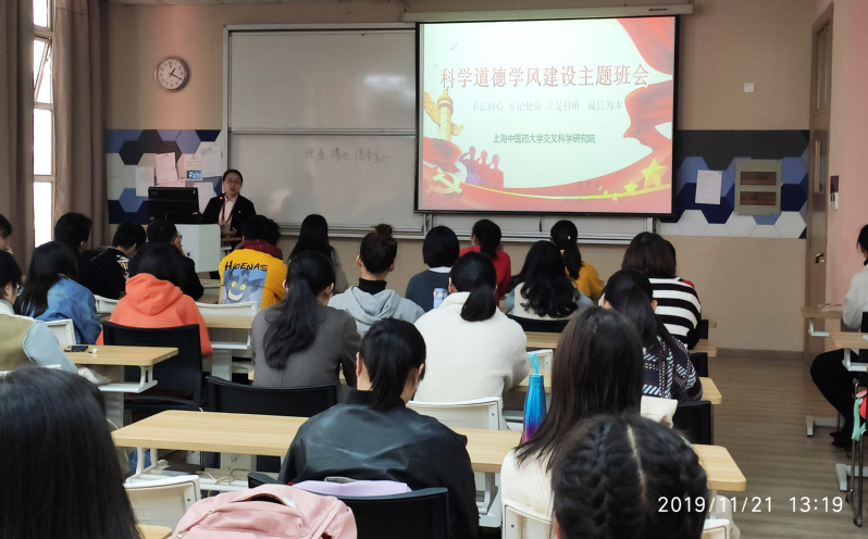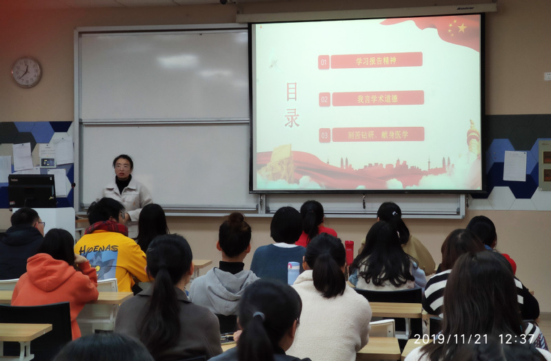 为学习贯彻习近平新时代中国特色社会主义思想、党的十九大精神、“科技三会”精神和习近平总书记关于科学道德和学风建设的重要指示精神,进一步推进科学道德和学风建设宣讲教育工作,深刻学习“2019年全国科学道德和学风建设宣讲教育报告会”的精神, 我院于2019年11月21日12:30,组织2019级全体研究生新生,在8205教室召开了以“不忘初心、牢记使命,立足科研,诚信为本”为主题的科学道德学风建设班会。