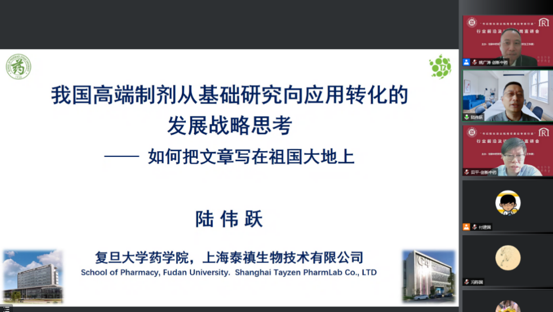宣讲会上,复旦大学特聘教授、上海泰禛生物技术有限公司创始人陆伟跃进行题为“我国高端制剂从基础研究向应用转化的发展战略思考——如何把文章写在祖国大地上”学术报告。陆教授着重介绍了我国药物制剂生产企业及品种现状、我国高端制剂的基础研究发展态势和高端制剂的发展瓶颈与共性目标,并针对我国高端制剂发展中存在的问题提出“加强基础、保持平衡、创新发展、注重应用”的战略对策。陆教授的报告使广大师生对我国高端制剂行业的发展有了深入了解和认识。