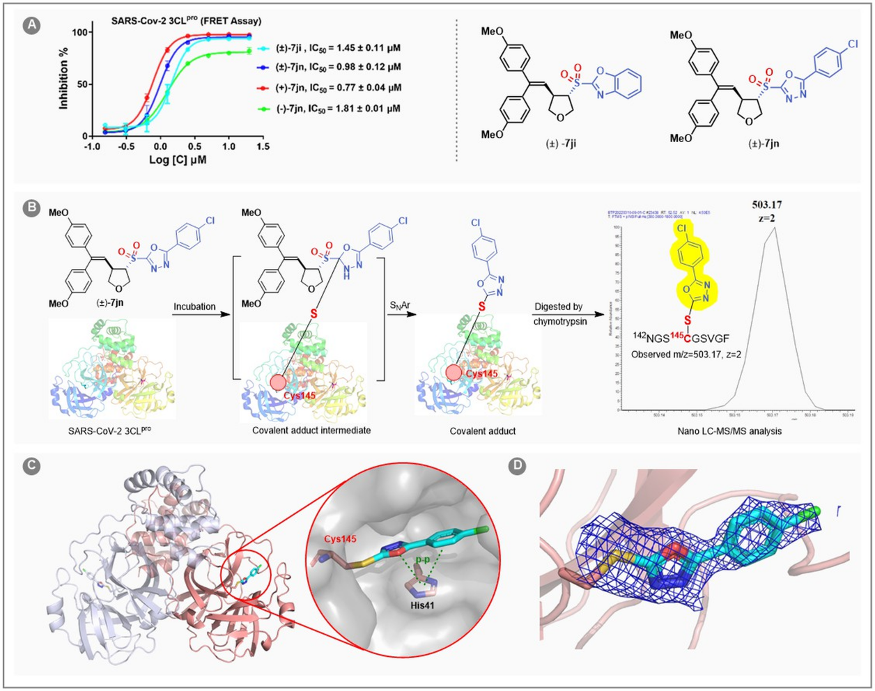 课题组通过系统的条件筛选,发现以含蒽基的螺环二酚(SPIONL)型的三氟甲磺酰基磷酰胺为催化剂,能够以良好的收率和对映选择性实现高烯丙基类硫醚化合物的构建。此催化体系对三环并环戊烷、环己烷、环庚烷、环辛烷、环辛烯以及开环体系均可实现良好到优秀的对映选择性。杂芳基砜化合物作为共价弹头可以通过与蛋白上的巯基残基发生SNAr反应,该课题组随后将衍生化得到的砜基类化合物针对新冠病毒3CLpro蛋白进行了活性筛选,发现含噁二唑的化合物具有较好的生物活性,最后通过蛋白质谱和共晶实验证明了此化合物是与3CLpro蛋白的Cys145残基发生了共价结合,证明了杂芳基砜化合物可以作为共价弹头,为其他共价药物的设计提供了新的思路。