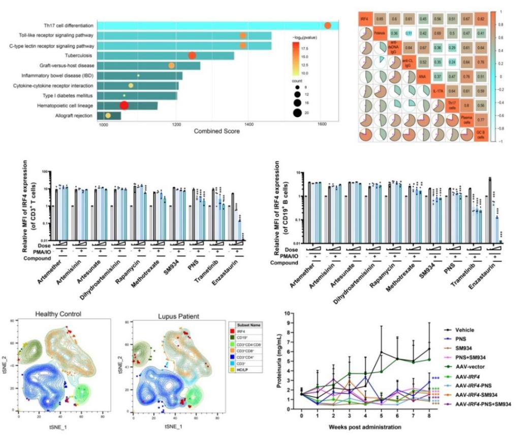 为深入了解IRF4对狼疮疾病进展和药物治疗作用的影响,研究人员应用IRF4抑制剂、腺相关病毒(AAV)介导的体内IRF4敲减及IRF4缺失的狼疮小鼠淋巴细胞过继转移(adoptive transfer)免疫缺陷小鼠等手段,证实抑制IRF4显著延缓狼疮小鼠肾炎进展,提高生存率,降低体内致病性Th17型细胞比例。同时,IRF4敲减后脾脏T及B细胞亚群IRF4的表达下调与SM934治疗后产生的IRF4 抑制效应相近。