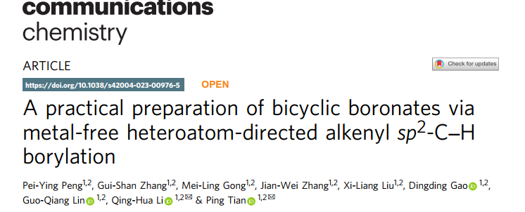 近日,我校创新中药研究院林国强院士团队田平课题组在自然科研(Nature Research)旗下期刊Communications Chemistry发表了研究论文A practical preparation of bicyclic boronates via metal-free heteroatom-directed alkenyl sp2-C‒H borylation,报道了一种无金属参与的杂原子导向烯基sp2-C-H硼化的方法。