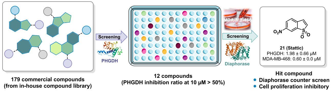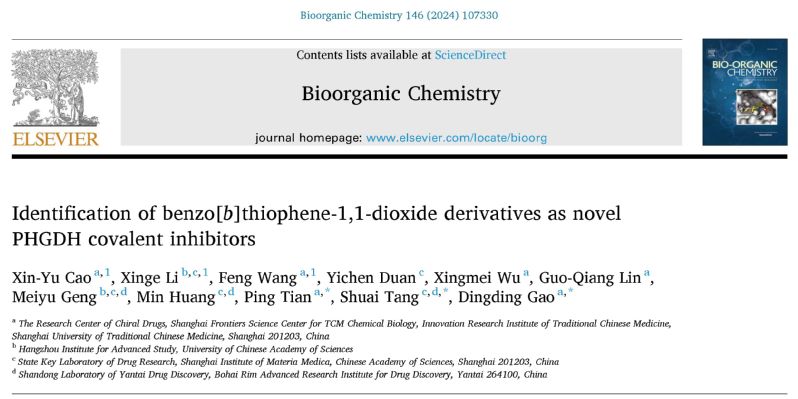 近日,我院田平课题组与中科院上海药物所黄敏课题组在生物有机化学国际著名期刊《Bioorganic chemistry》上发表研究论文“Identification of benzo[b]thiophene-1,1-dioxide derivatives as novel PHGDH covalent inhibitors”(DOI:10.1016/j.bioorg.2024.107330),通过化合物筛选、结构优化以及后续的生物机制研究,报道了一类靶向丝氨酸合成通路的关键限速酶PHGDH的新型共价抑制剂。