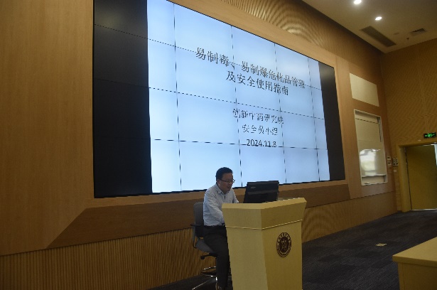 接着,在6301教师室开展我院的新生、新教师安全培训,此次培训邀请了科技处楼芳嫣老师、保卫处陆暘老师指导,由田平副院长主持,院办和学院安全管理小组吴飞及张曙盛老师负责讲座。张曙盛老师进行了实验室安全主题的讲座,重点强调实验室安全的重要性,介绍了影响实验室安全的因素、实验室安全规则、实验室安全防护基本措施(安全三件套)和常用装置。提醒大家养成良好的实验习惯,并牢记实验室安全禁忌,做到要多想、多问、多查。吴飞老师介绍了我院易制毒易制爆试剂的管理、使用相关规定,并讨论了提升学院安全管理和安全服务水平的具体措施要点,还介绍了实验室垃圾分类的实施及安全事项。
