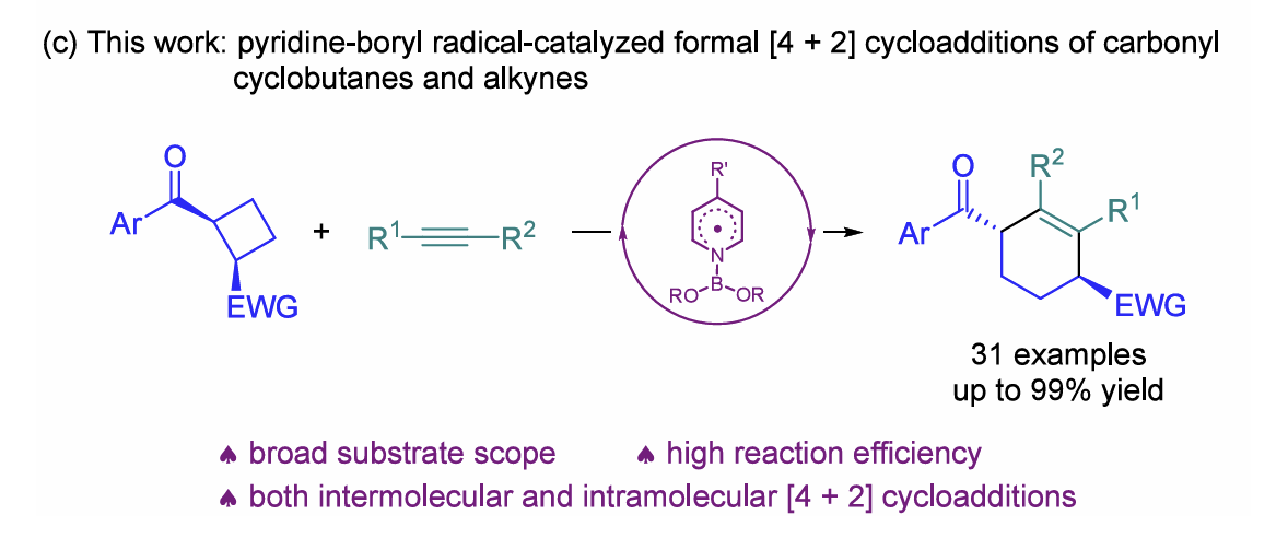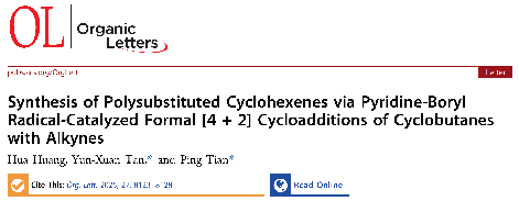 近日,我院田平研究员课题组在有机化学著名自然指数期刊《Organic Letters》上发表研究论文“Synthesis of Polysubstituted Cyclohexenes via Pyridine-Boryl Radical-Catalyzed Formal [4 + 2] Cycloadditions of Cyclobutanes with Alkynes”(DOI:10.1021/acs.orglett.5c02553)。