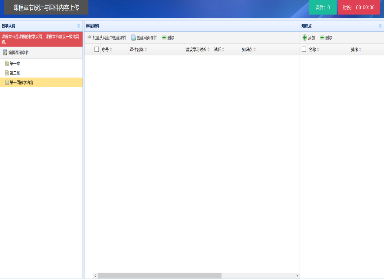 2.选择课程导学、可以编辑课程的基本要求。选择章节、知识点设计及课件上传可以添加课件。