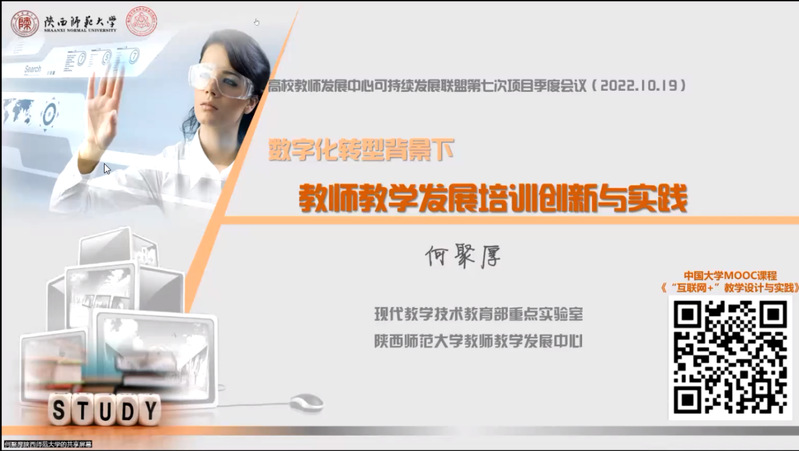 会上,舒静副校长、陕西师范大学现代教学技术教育部重点实验室副主任何聚厚教授分别作了“推进教学学术,探索教师专业发展新路径”和“数字化转型背景下教师教学发展培训创新与实践”的主旨报告,报告从高校骨干教师教学专业能力提升的路径创新和信息化融合两个方面进行了分享。
