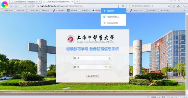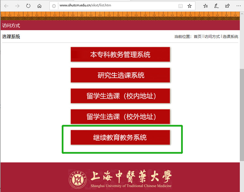 2.校外登录需先登录VPN,再登录学校选课系统网页(选课系统 (shutcm.edu.cn)),点击【继续教育教务系统】;