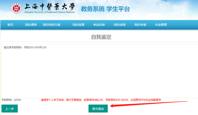 7.进入自我鉴定界面,请学生填写300-600字内的个人学习总结,首行无需缩进,段落不要超过5段,填写完成可点击【提交鉴定】;