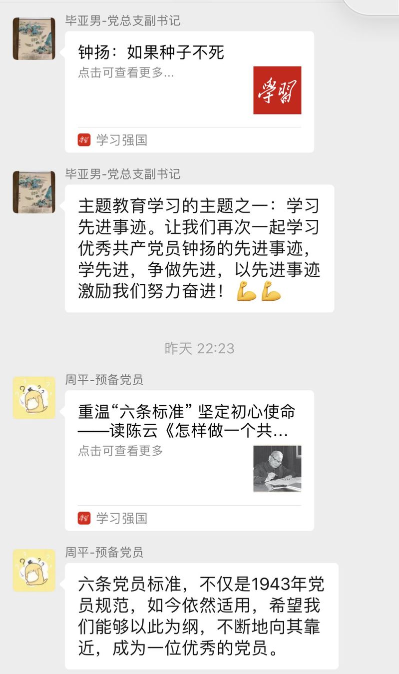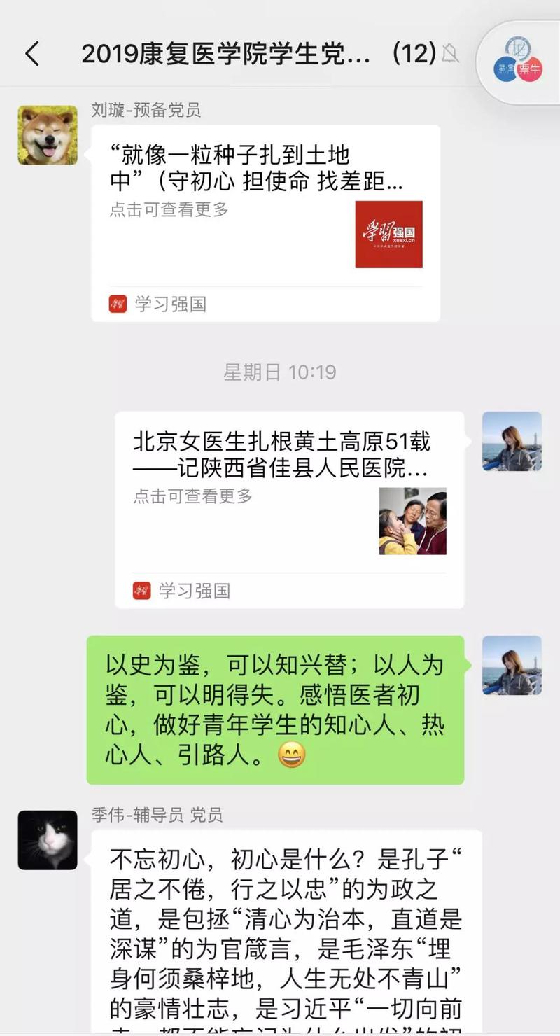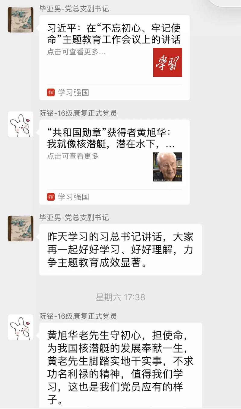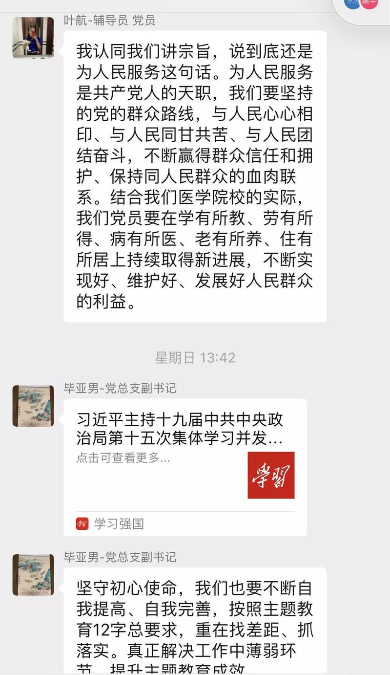 近期,康复医学院学生党支部每一位党员每天自发地在群里分享个人自学《习近平关于“不忘初心、牢记使命”重要论述摘编》、《习近平新时代中国特色社会主义思想学习纲要》等主题教育学习资料的心得体会。