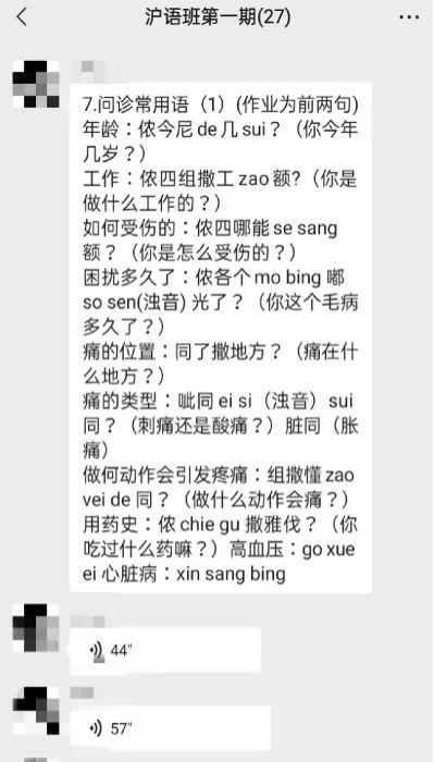 我院导师团导师、青年教师班主任柏怡文老师特聘了两位正宗的上海话的老师,我们身边最热心的上海同学朋辈辅导,在19级率先开始了第一期的沪语培训班,进行了为期10天的沪语培训。最基础的称呼与问候,到基本的身体部位,再到医患沟通中的专业术语康复特有的词汇都应有尽有