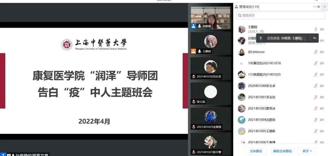 目前上海的疫情形势依然严峻,在全力做好身体健康防护的同时,同学们的心理健康也不容忽视。面对疫情,积极乐观的情绪和健康向上的心理状态,也是一种强大的免疫力!为引导同学们在抗击疫情的同时心怀感恩,以积极的心态应对这次挑战。4月24日晚,康复医学院“跨界协同育人•服务学生成长”导师团开展了以“告白‘疫’中人”为主题的线上班会活动。本次班会由辅导员王鹏程、孙雅静主持,润泽导师团导师、青年教师班主任蔡增亮、李洋、霍贝贝、秦真侠共同参与。