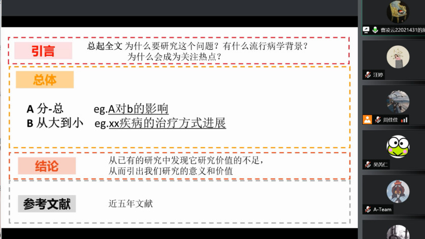 学姐具体从选题、文章结构两方面展开介绍。第一,她建议同学们在选题时题目范围不宜过大,应该聚焦于某种具体的疾病、某一特定的治疗方式或患病人群。对于选题有困难的同学,学姐建议可以尝试九宫格学习法,以课题为中心进行拓展。