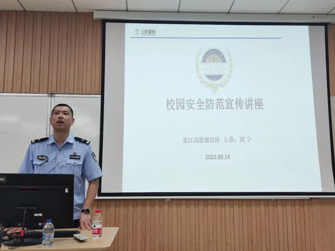 本次开学第一课,还特别邀请了张江高校派出所的刘宁警官为全体新生做校园安全防范宣传讲座。通过开场充满趣味的有奖知识竞猜后,刘宁警官带领同学们了解了大学校园中常见的各类诈骗手法。由最为高发的“冒充熟人诈骗”和“刷单返利”到“网络游戏的虚假交易”与“网购冒充客服”,刘宁警官通过一桩桩真实案例及血泪教训加深大家对校园诈骗认识同时,掌握了鉴别和应对诈骗的方法,帮助同学们预防日后可能遭遇的经济安全隐患,赢得了同学们的阵阵欢笑和掌声。