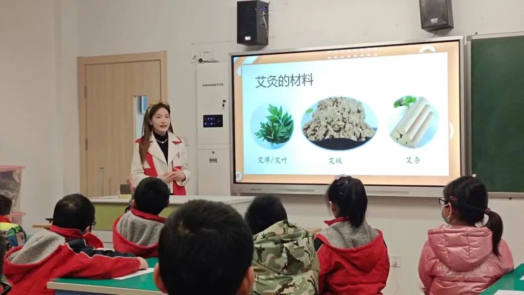 在本次教学活动中,志愿者们精心准备了视频资料,并且通过提问与互动的形式带领小朋友们学习了有关艾灸的小知识,如艾草的生长,艾灸的原理、机制、好处、做法、注意事项等。