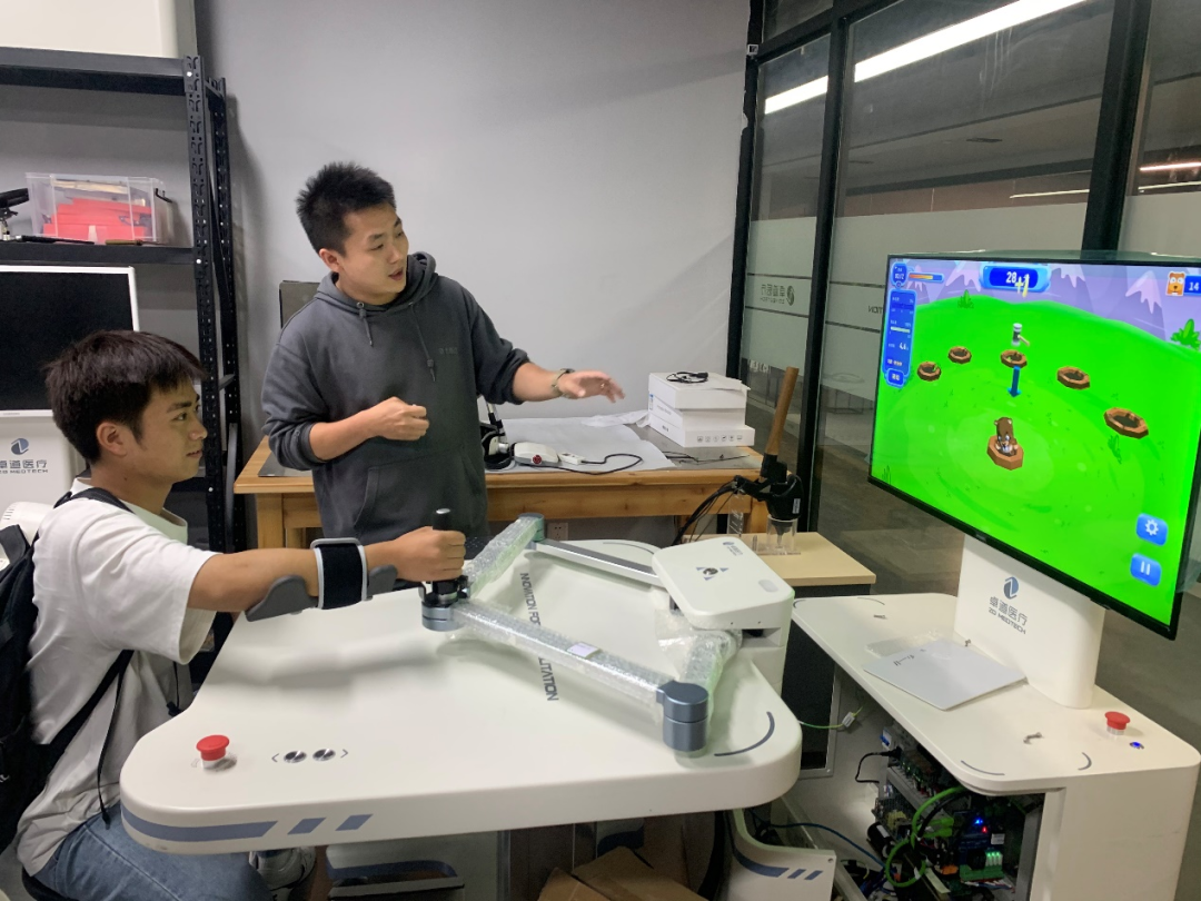 在产品展示区中,师生们近距离体验了上肢康复训练系统、体感情景交互康复训练和评估系统、多体位踝足康复机器人等康复类器械,感受机器人技术和医疗技术深度融合的优势。区别于传统康复器械,产品加入了多感觉反馈与实时任务导向情景交互,使康复训练更具趣味性和实用性,并引发了同学们的思考和疑问。负责人们也对同学在参观和体验中产生的问题进行答疑解惑。