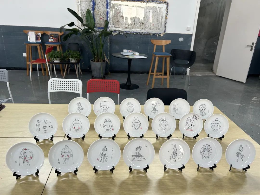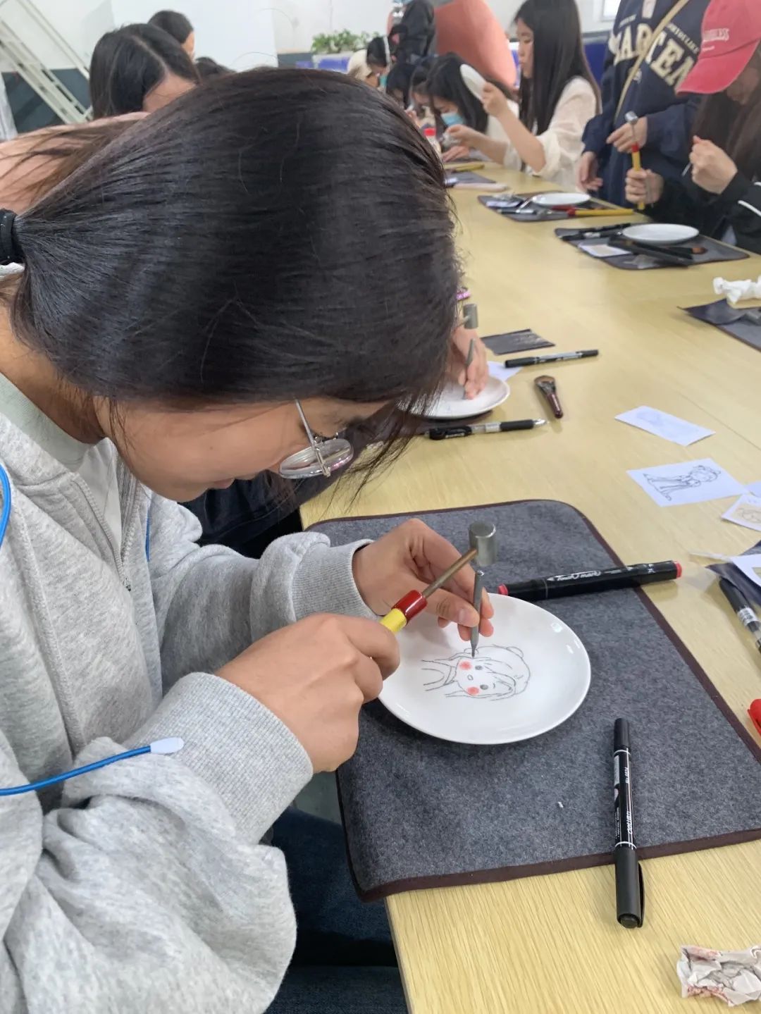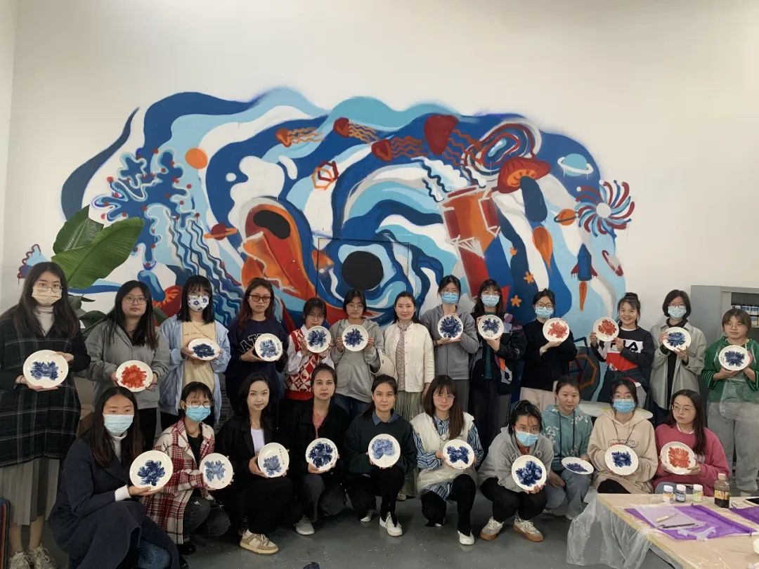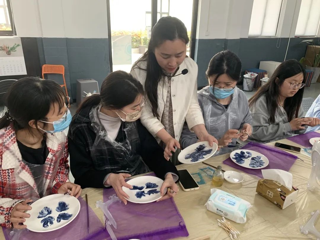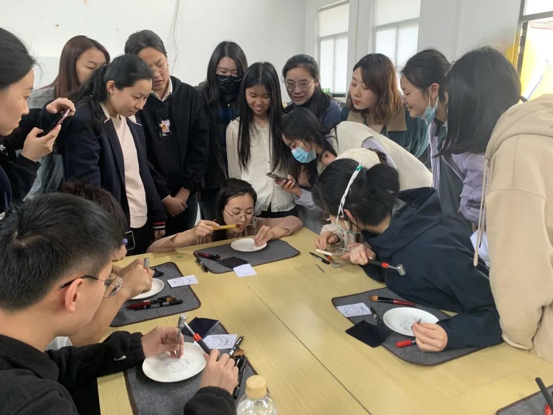 紧接着,同学们在老师指导下,怀着对非遗文化的学习热忱,来到了活动体验室,进行瓷刻和指掌画的制作。卢亚茹老师详细介绍刻瓷技艺的历史与发展、技法与艺术,同时展示一系列的刻瓷作品。同学们会在卢老师的指导下,学习“点”刻法、“线”刻法等技能,瓷刻作为较小众的非遗传统文化,别具特色,带给师生新鲜的体验感,在叮叮当当的敲击声中逐渐呈现完整的作品,成就感油然而生。而另一边进行指掌画体验的师生们也在白瓷器皿上天马行空,手绘花朵图案,一幅幅作品栩栩如生。非遗传承人张洁老师详细介绍了指掌画的传承情况及创作技巧,一步步带领同学们完成花卉作品,告诉同学们如何运用手指和手掌作画,还不时对大家的作品进行修改和指导,协助同学们完成创作。师生们在动手实践中感受中华优秀传统文化的精髓,在“知行合一”中收获真正的成长。