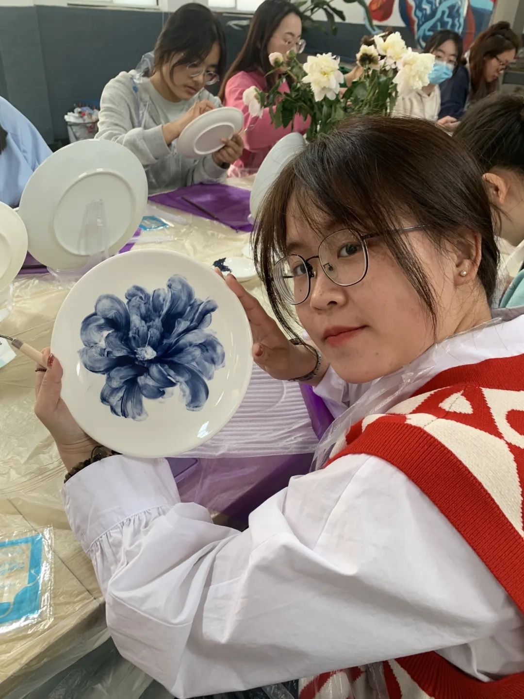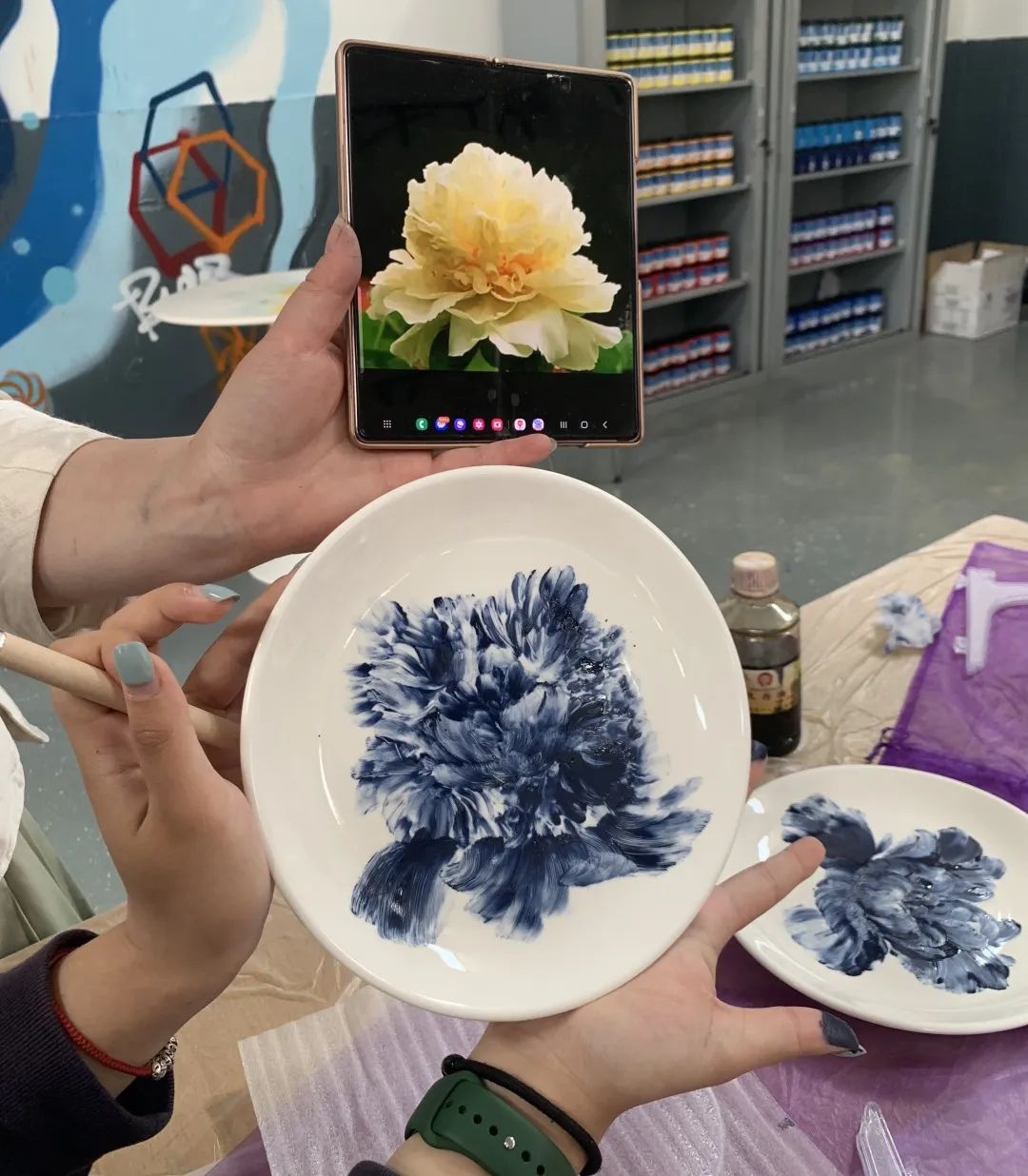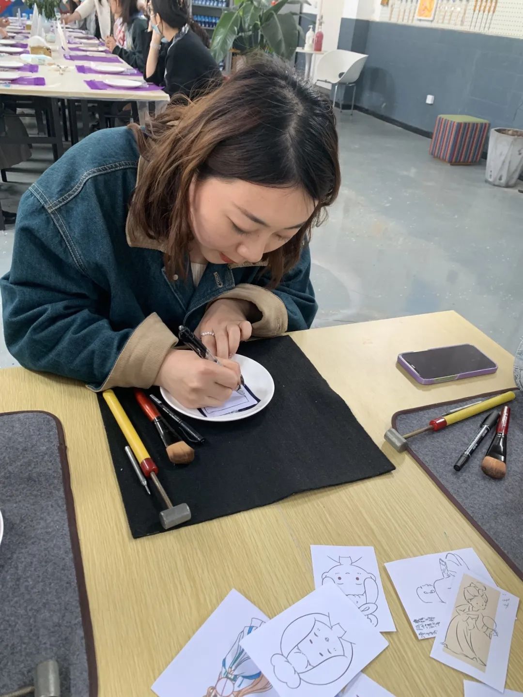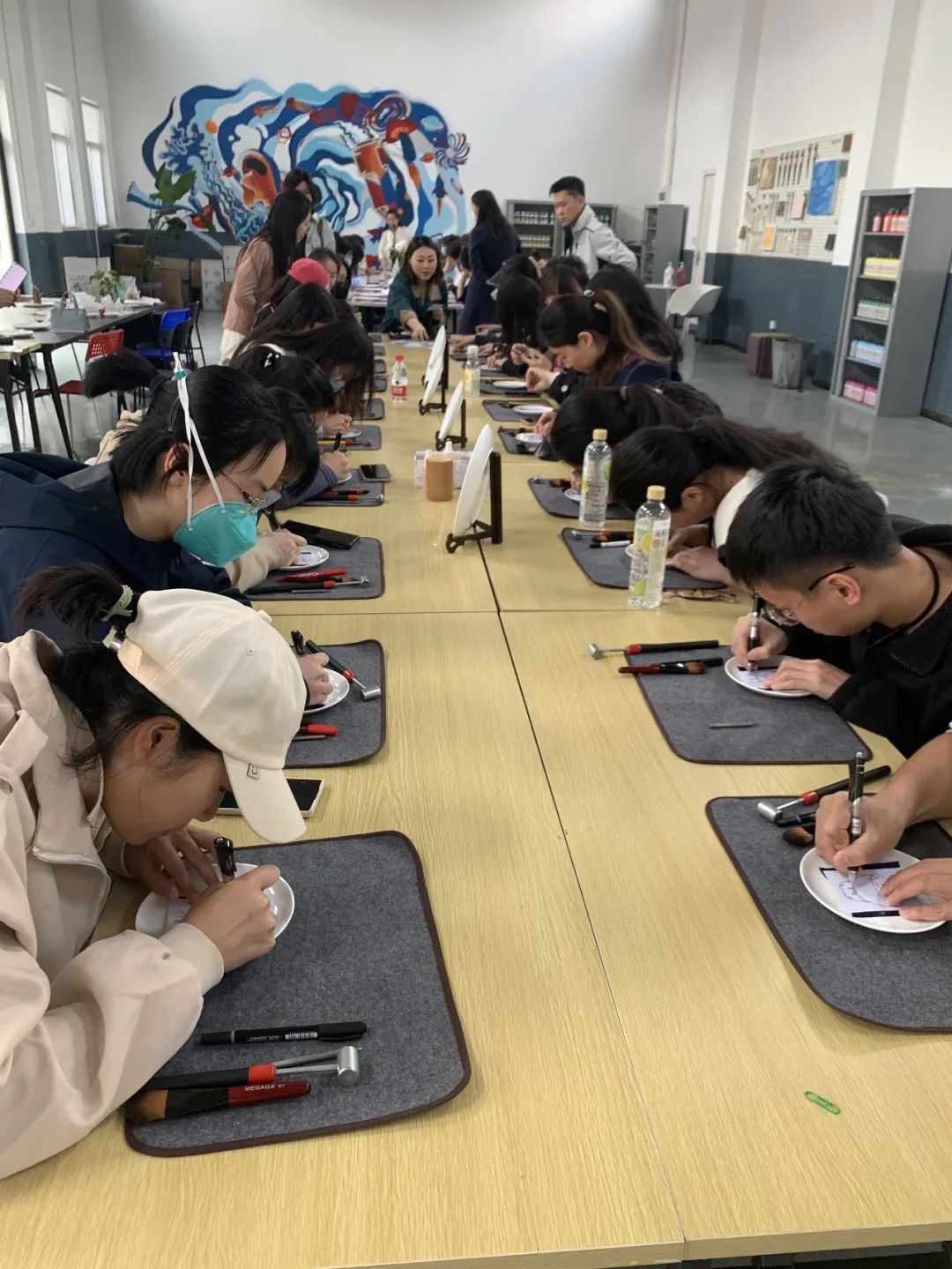 紧接着,同学们在老师指导下,怀着对非遗文化的学习热忱,来到了活动体验室,进行瓷刻和指掌画的制作。卢亚茹老师详细介绍刻瓷技艺的历史与发展、技法与艺术,同时展示一系列的刻瓷作品。同学们会在卢老师的指导下,学习“点”刻法、“线”刻法等技能,瓷刻作为较小众的非遗传统文化,别具特色,带给师生新鲜的体验感,在叮叮当当的敲击声中逐渐呈现完整的作品,成就感油然而生。而另一边进行指掌画体验的师生们也在白瓷器皿上天马行空,手绘花朵图案,一幅幅作品栩栩如生。非遗传承人张洁老师详细介绍了指掌画的传承情况及创作技巧,一步步带领同学们完成花卉作品,告诉同学们如何运用手指和手掌作画,还不时对大家的作品进行修改和指导,协助同学们完成创作。师生们在动手实践中感受中华优秀传统文化的精髓,在“知行合一”中收获真正的成长。