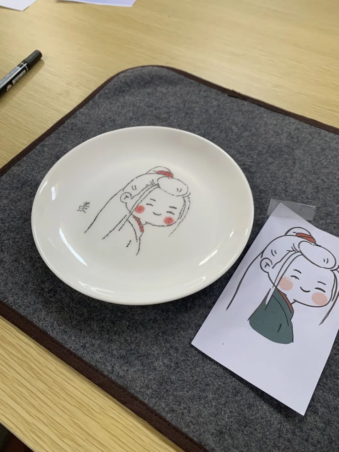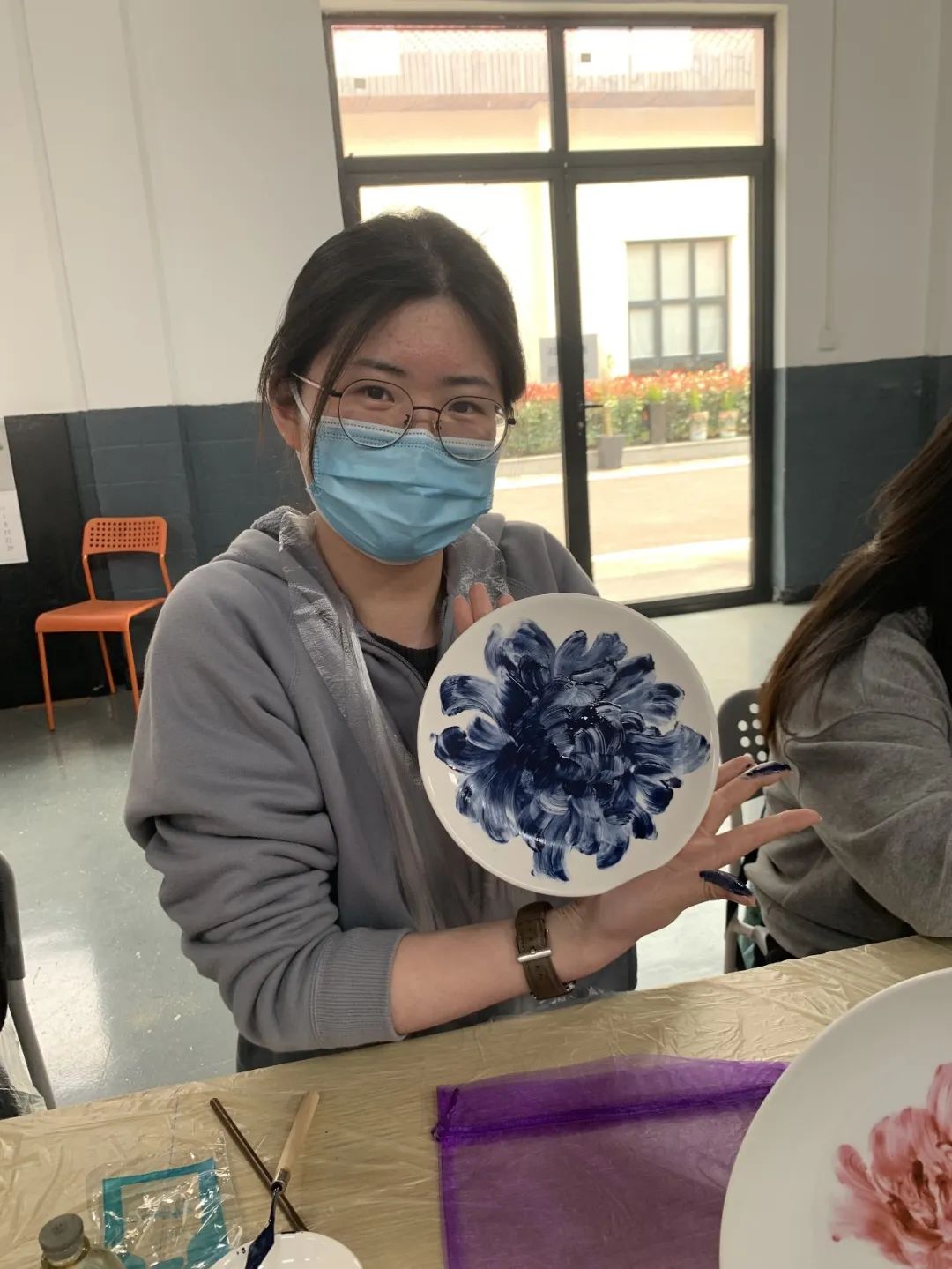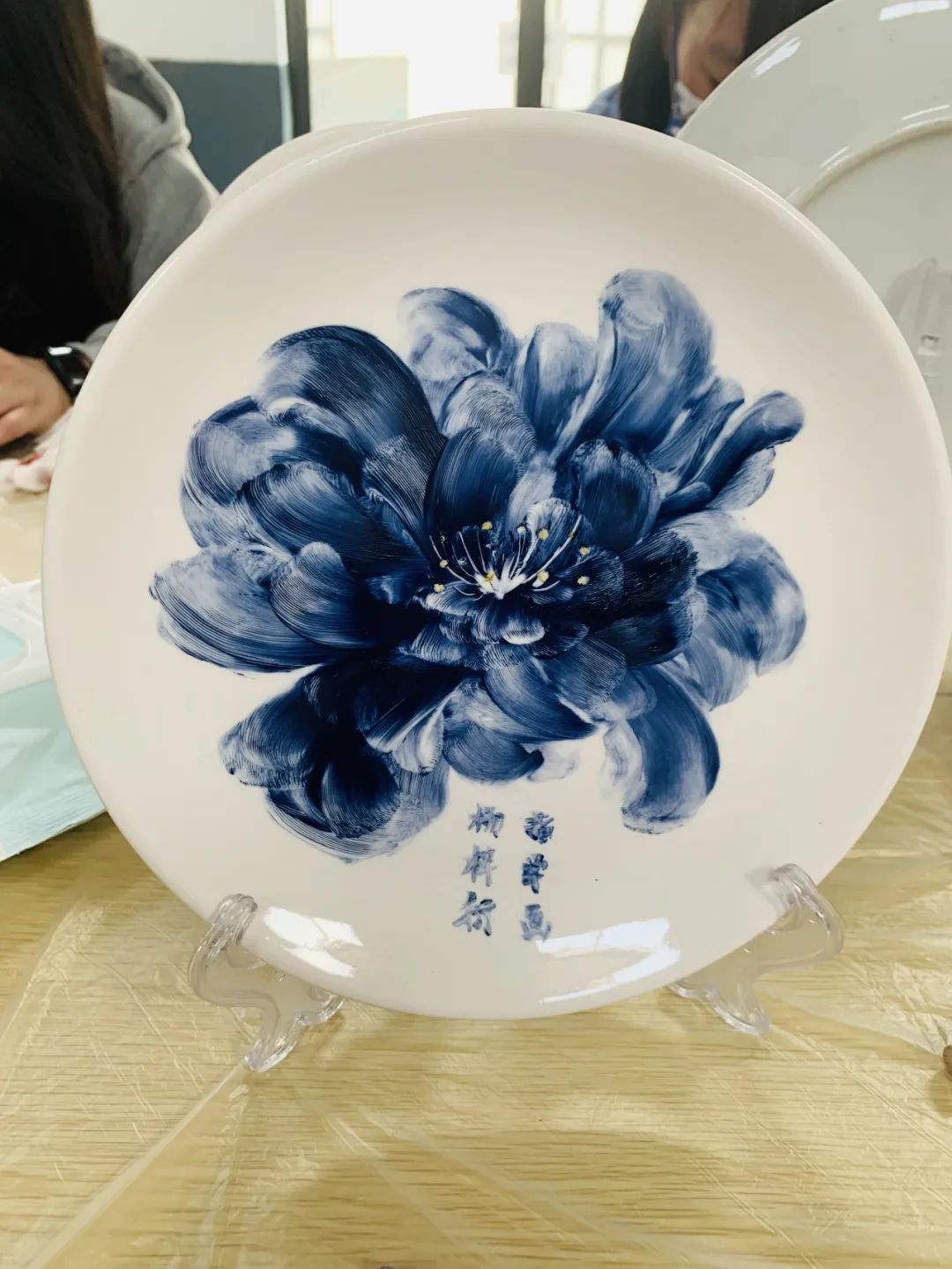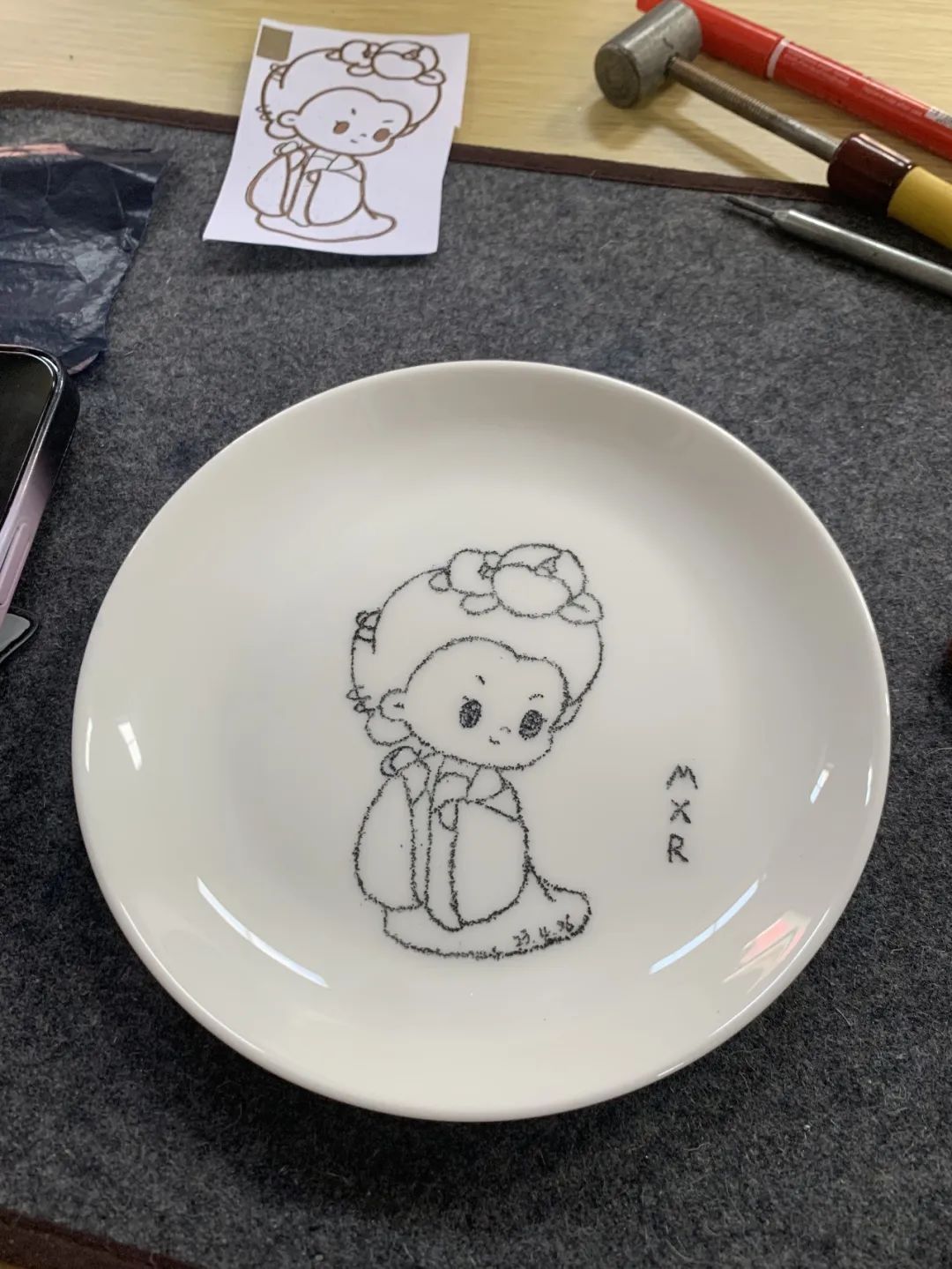 紧接着,同学们在老师指导下,怀着对非遗文化的学习热忱,来到了活动体验室,进行瓷刻和指掌画的制作。卢亚茹老师详细介绍刻瓷技艺的历史与发展、技法与艺术,同时展示一系列的刻瓷作品。同学们会在卢老师的指导下,学习“点”刻法、“线”刻法等技能,瓷刻作为较小众的非遗传统文化,别具特色,带给师生新鲜的体验感,在叮叮当当的敲击声中逐渐呈现完整的作品,成就感油然而生。而另一边进行指掌画体验的师生们也在白瓷器皿上天马行空,手绘花朵图案,一幅幅作品栩栩如生。非遗传承人张洁老师详细介绍了指掌画的传承情况及创作技巧,一步步带领同学们完成花卉作品,告诉同学们如何运用手指和手掌作画,还不时对大家的作品进行修改和指导,协助同学们完成创作。师生们在动手实践中感受中华优秀传统文化的精髓,在“知行合一”中收获真正的成长。