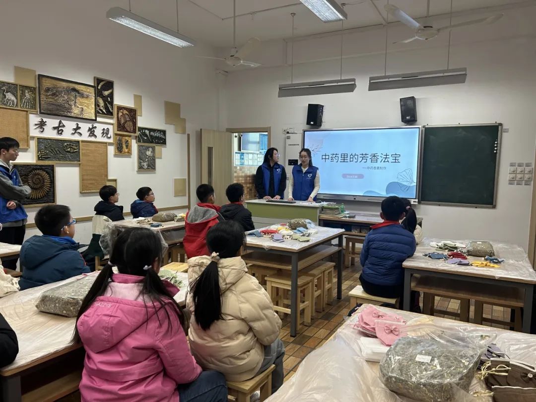 志愿者们首先向小学生们介绍了香囊在中华传统文化中的重要意义。随后,志愿者们详细讲解了三种香囊——防蚊驱虫、防疫避秽、悦脾开胃香囊的功效及其中药配伍,并示范制作香囊的步骤,进行教学。