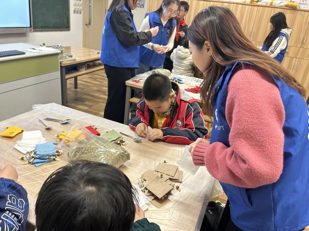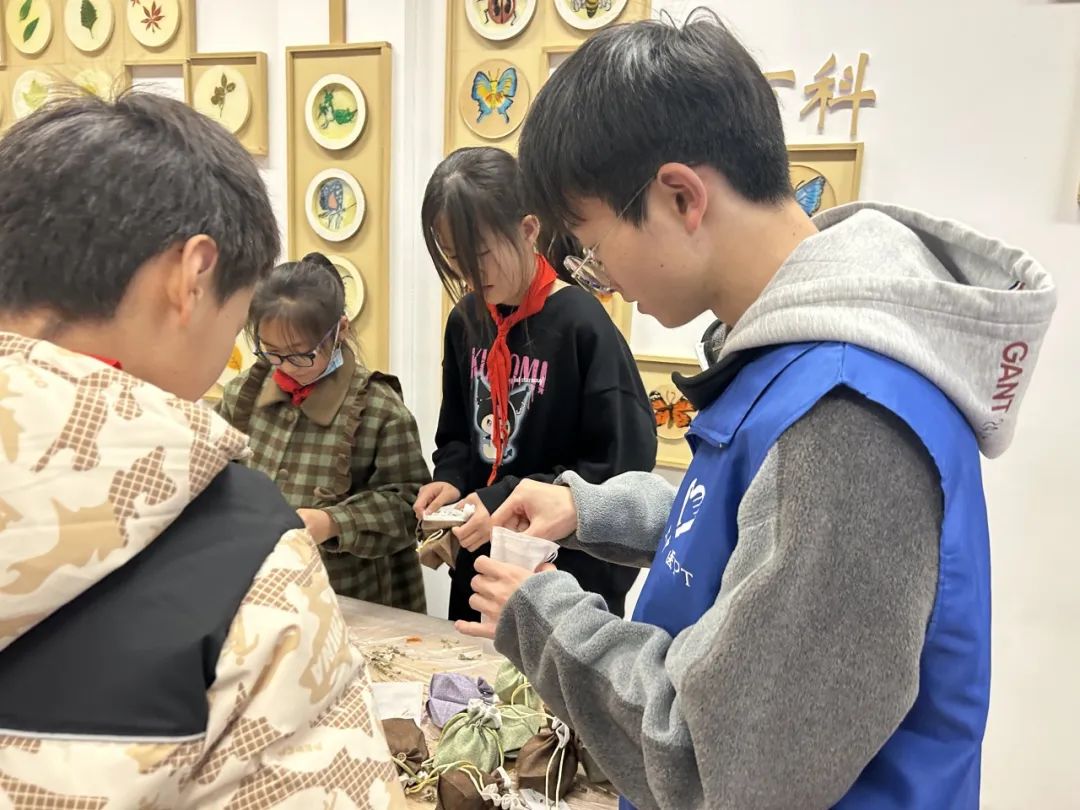 小学生们兴趣盎然地动手制作自己的香囊。他们认真地将香料填充到内胆中,用丝带系紧,再放入精美的香囊袋中。孩子们相互交流、分工合作,共同完成了一个个饱满可爱的香囊,成就感满满。
