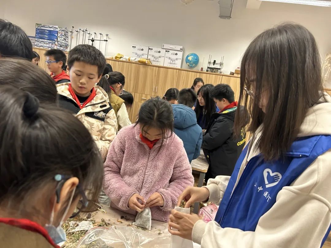 今天是春分,太阳直射赤道,昼夜等长,天气温暖、阳光明媚。很荣幸在这样的平凡日子里,闻着草药的清香,协助小朋友制作香囊。艾叶、丁香、薄荷、藿香、佩兰、陈皮相互配合,防蚊驱虫,大学生志愿者和五年级小朋友,大手拉小手,共同感受中药的魅力。习近平总书记指出,“只有全面深入了解中华文明的历史,才能更有效地推动中华优秀传统文化创造性转化、创新性发展。”中医药文化是中医药事业发展的根基与灵魂,孩子们从小就接触感受中医药,有利于发扬我们的文化自信。孩子们活动中表现出来的坚韧、睿智,让我切身体会到了什么叫“长江后浪推前浪”,10后的小孩哥、小孩姐如此优秀,我们00后也得加油啊。