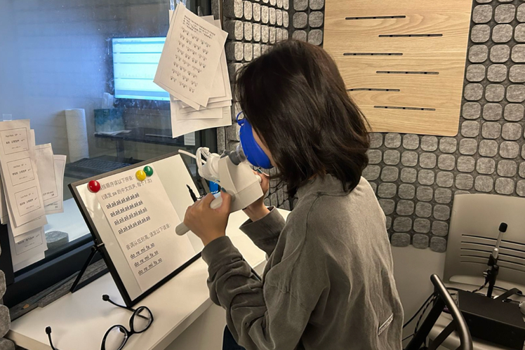 5月29日,杜肯在读研究生田学姐为我们介绍了她正在开展的研究:普通话词汇声调的空气动力学、声学和感知特征。学术交流之余,学姐还和我们分享了自己在美国的升学经历生活日常等等。交流会后,我们参与了实验,感受声音背后的奇妙原理。