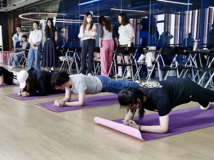 在互动环节中,刘垚院长和健身教练郑思念老师带领同学们通过简单的测试对自己的体能状况进行了评估。评估涵盖了上、下肢力量与耐力、核心控制与力量以及柔韧性等。在评估过程中,两位老师强调了动作正确的重要性,针对同学的错误动作进行了指正,同学们也积极配合参与,现场气氛热烈有序。