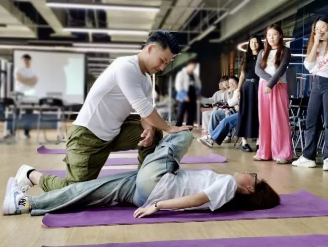 此外,两位老师还为同学们演示了专业的拉伸动作,并亲自指导同学们进行实践。通过拉伸训练,不仅可以缓解肌肉紧张,提高身体的柔韧性和灵活性,还有助于预防运动损伤,提升运动效果。