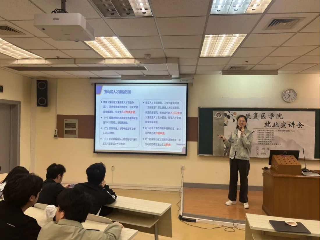 上午,我院召开了康复专场就业宣讲会,活动由康复医学院党委副书记毕亚男主持,活动邀请了包括上海市养志康复医院(上海市阳光康复中心)、上海市第一康复医院、上海市第二康复医院、上海市第三康复医院、上海市第四康复医院、上海申养康复医院、上海新起点康复医院有限公司7家用人单位进行专场宣讲。宣讲会上,各用人单位详细介绍了单位的发展历程、成果成就、未来规划、岗位需求及福利待遇等,并与现场同学进行交流并提供应聘沟通渠道,以促进双方的进一步了解。