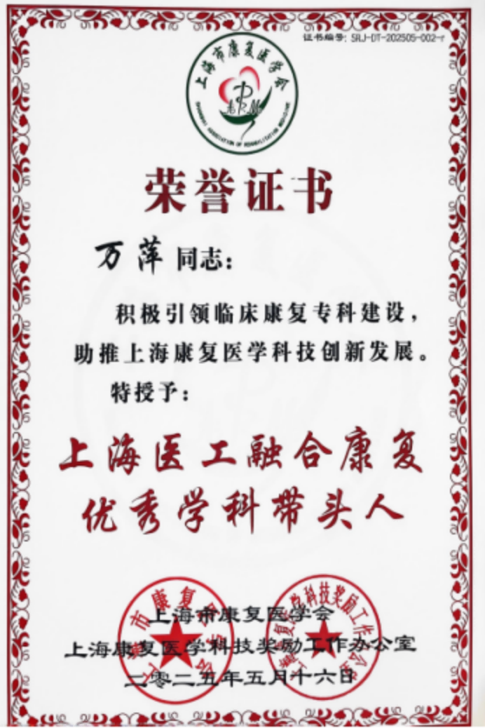 我校康复医学院言语听力教研室主任万萍教授获“上海医工融合康复优秀学科带头人”荣誉称号。2023年6月,在各级领导带领下,万萍教授牵头组织了上海市康复医学会吞咽康复专业委员会。每年承办吞咽康复论坛,并开展吞咽康复师继续教育项目,包括基础班和高级班,已培养近50名吞咽康复师。2025年继续负责吞咽康复论坛,并筹备高级班培训,推动诊断和治疗方法的标准化、规范化和科学化发展,并推广至长三角地区。