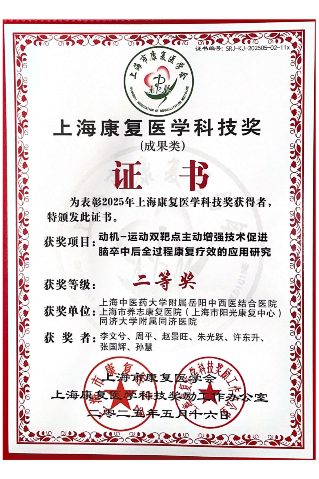 2025年5月16日下午“第十五届上海康复医学科技奖励大会暨标准引领康复新质生产力高质量发展研讨会”在上海美丽园酒店隆重召开,旨在奖励在上海康复医学事业发展进程中做出卓越贡献的个人和团队。我校康复团队和个人获多项殊荣。