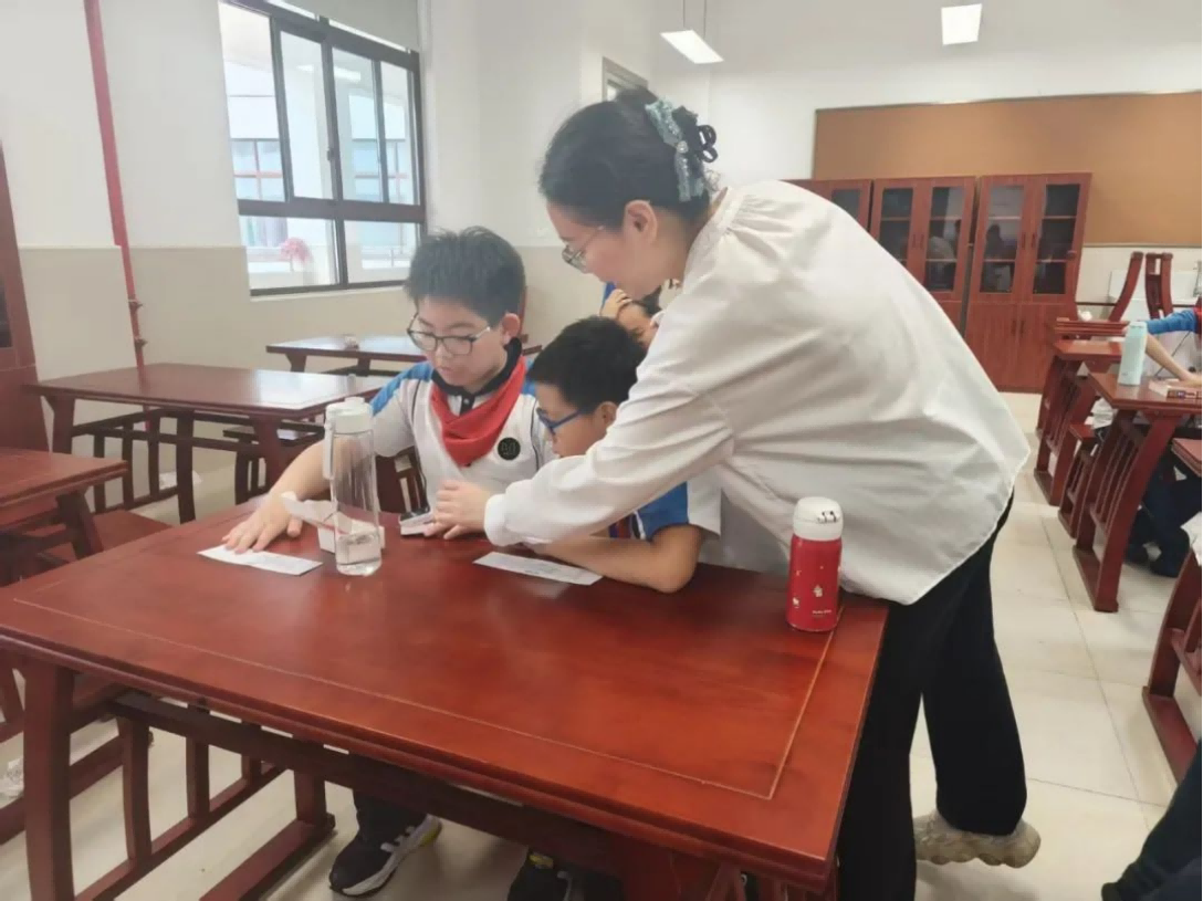 活动中,老师们与志愿者共同设计了多项沉浸式体验环节。在“感受心跳”环节,学生通过摸脉,感受脉象的从容和缓、柔和有力,接着通过指脉氧量化心率、血氧指标,观察静息状态和运动后的心跳变化,直观感受心脏节律与健康的关联。在“血压探秘”小实验中,学生们在老师和志愿者的指导下尝试用水银血压计互相测量,学习正确监测血压的方法。