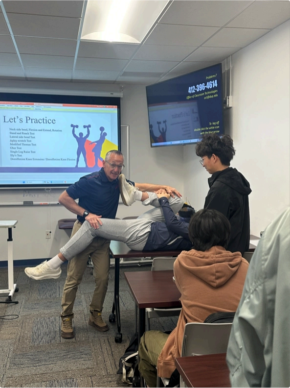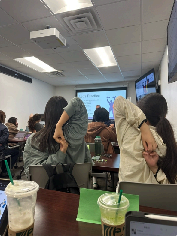 6⽉2⽇,Dr.Martin给我们介绍了康复评估中读姿势、步态、关节活动度、柔韧性和肌⼒评估相关的内容,这与我们之前所学的⼈体运动学和康复物理治疗评估的内容密切相关。在课上,我们两两分组,为同伴评估体态姿势,通过前、侧、后视图观察对称性、⾝体垂线对⻬进⾏评估,我们也通过观察不同同学的步态针对他们的问题进⾏分析、诊断,这为我们今后在⼯作中为患者进⾏评估诊断提供了思路和基础。