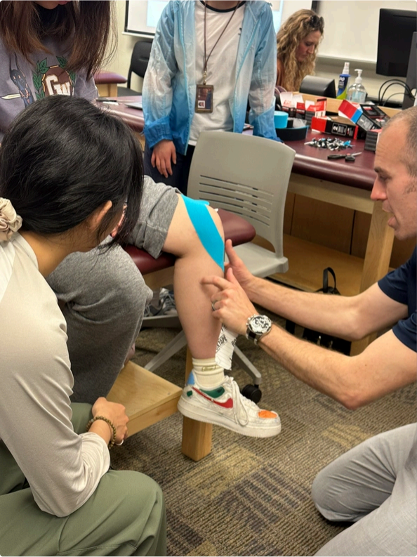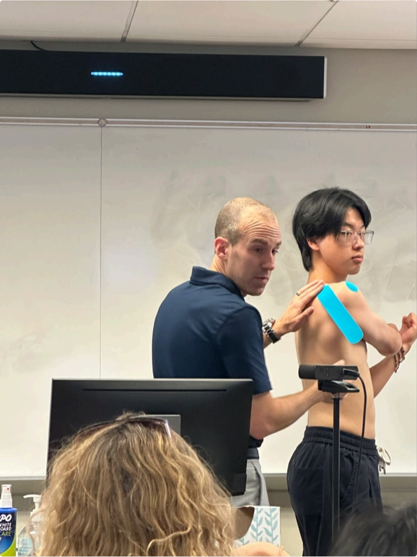 6⽉ 5⽇,Dr.Robert为我们介绍了肌内效贴(以RockTape为例),它是不含乳㬵的棉质弹性治疗贴布,有不同粘性类型可选。它能缓解疼痛、减轻软组织压⼒、改善神经感知,原理和神经信号传导、⾎液循环以及“ ⻔控理论” 相关。还讲到贴扎前要清洁⽪肤、处理边角,贴时注意张⼒控制;提醒过敏体质先做测试,有深静脉⾎栓等情况不能⽤。最后与⼤家分享了肩、膝、腰等部位的贴扎⽅法和实⽤技巧。