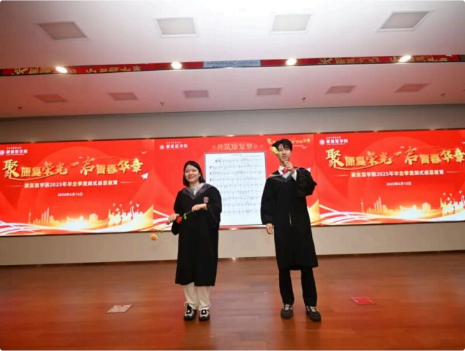 随后 ,康复医学院 2025 年毕业季原创MV《康复荣光》 ⾸发。 ⾃2017 年以来 ,康复医学院倾⼒打造的毕业感恩教育MV 成为闻名校内外的品牌育⼈项⽬,既是毕业季的温情赠礼 ,更是学院⽴德树⼈的⽣动实践。今年的毕业季歌曲延续师⽣携⼿创作的传统 , 由教师徐曙天作词、