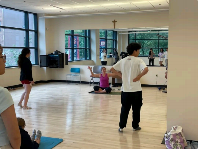 当天下午 ,为了让我们对瑜伽有更好的认识 ,Martin 教授为我们在学校的健⾝房安排了⼀节时⻓为⼀⼩时的瑜伽课。在瑜伽⽼师的指导下 ,聆听着舒缓的⾳乐声 ,我们完成了⼀系列的瑜伽训练 ,让不熟悉瑜伽的同学们有了简单的⼊⻔体验。