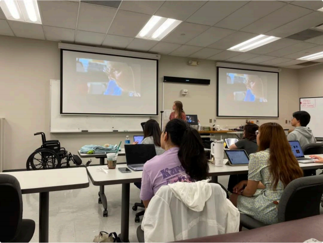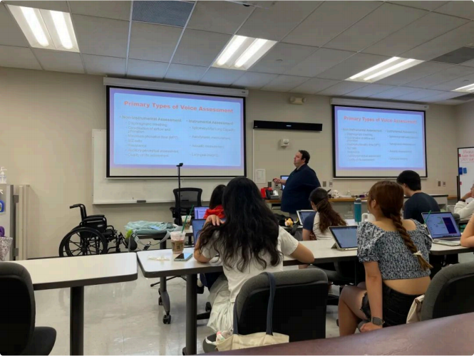 6 ⽉ 19 ⽇,Rangos教授主要讲解了发声障碍的评估与治疗 ,并在其中穿插了构⾳障碍、失语 症等等病症的病因解读 ,声⾳所代表的信息及其评估⽅法等等 ,使教学内容更加丰富 ,也使得同学们对于构⾳障碍有了更⼤的兴趣。 同时 ,我们了解到各类量表及测量设备的原理及区别 ,并学习改善⽅法 ,同学们也在Rangos教授的带领下练习了腹式呼吸等评估⽅法 ,收获颇丰。