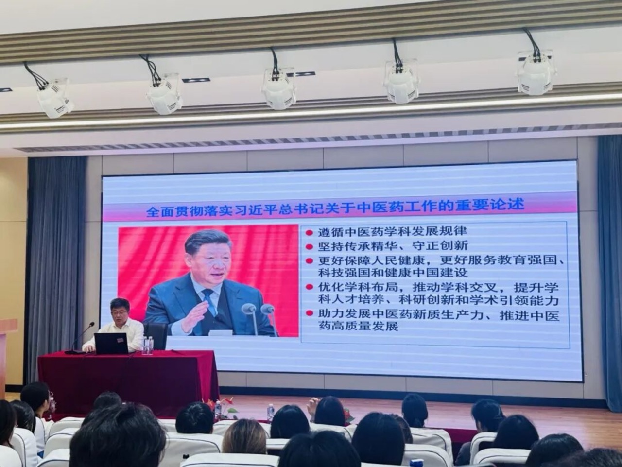 王校长以“我对中医康复学的理解”为题,向同学们深入描述了康复行业的由来与前景,以生动详实的数据和案例告诉同学们“建立康复专业自信”的重要性,勉励同学们笃定投身康复事业未来必定大有可为。他提出“心无旁骛、贵在坚持”的成长秘诀,叮嘱同学们要锤炼工匠精神,潜心读书练技,学会归纳整合信息,并逐步形成独到见解与创新能力。