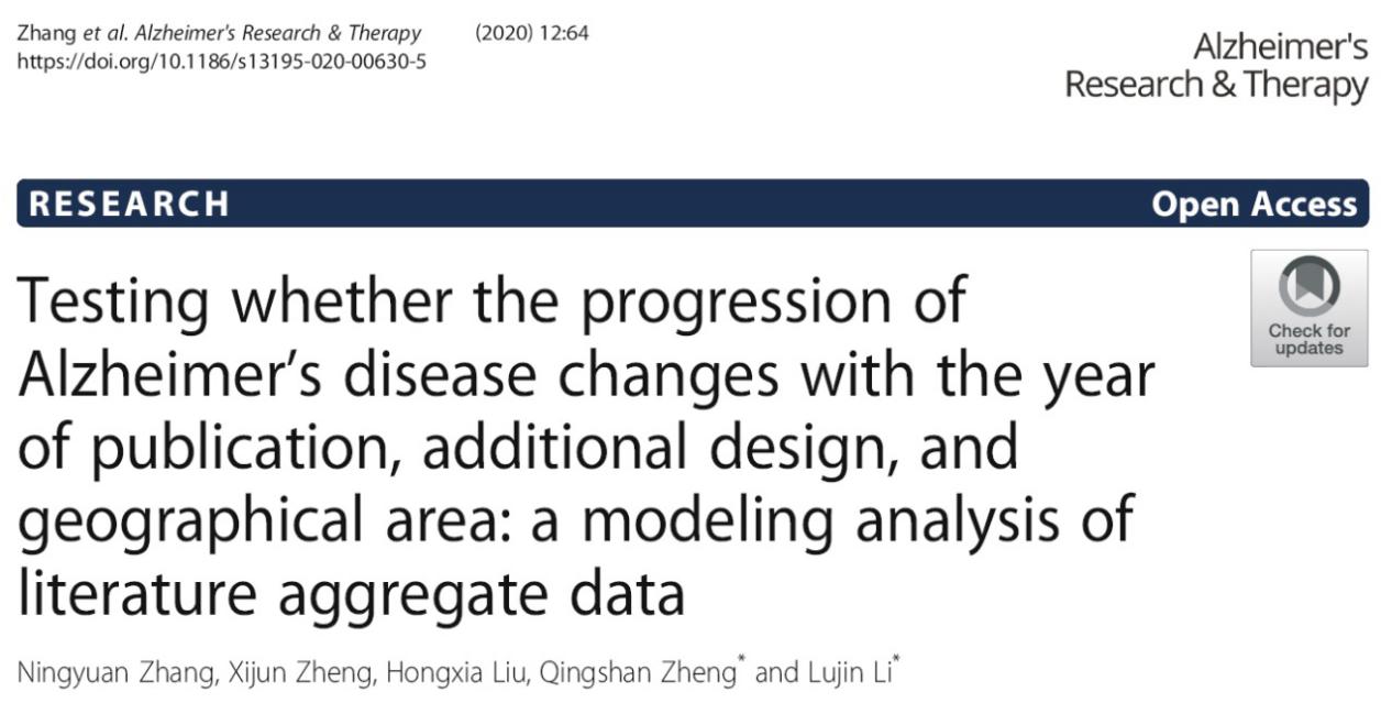 阿尔兹海默症是与衰老相关的难治性疾病,国际上进入临床试验阶段的新药多以失败告终。如何早期评估新药开发前景,如何确证疗效以减少争议,需要可信的评价尺度。阿尔兹海默症未经有效干预的疾病进展过程,在随机对照试验的安慰剂患者中呈现,如果通过合适的数学建模,就能形成一种有价值的评判标尺。近日,我校交叉科学研究院郑青山团队,采集了全球AD临床试验数据,其中安慰剂受试者多达19210名,据知这是迄今为止该研究领域收集到的最大的AD临床试验数据。通过建立数学模型,对AD临床试验中安慰剂组的疾病进程和安慰剂效应及其影响因素进行了全面的定量分析。在阿尔兹海默症专业期刊Alzheimer's Research & Therapy(IF=6.142)在线发表了题为《阿尔兹海默症疾病进程是否随发表年份、加载给药设计和地理区域而变化:基于汇总数据的建模分析》(Testing whether the progression of Alzheimer’s disease changes with the year of publication, additional design, and geographical area: a modeling analysis of literature aggregate data)的研究论文。我校交叉科学研究院博士研究生张宁远为论文第一作者,李禄金副研究员和郑青山教授为共同通讯作者。