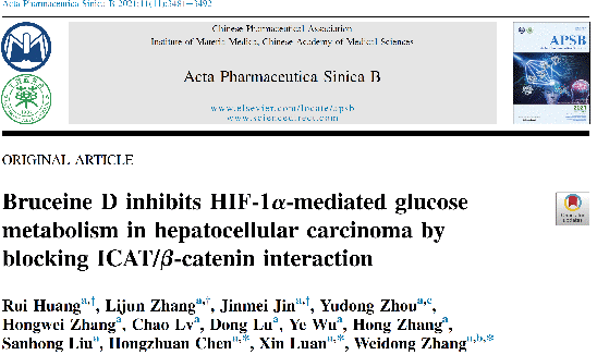 近日,我校交叉科学研究院陈红专教授、张卫东教授及栾鑫研究员团队合作在抑制肿瘤细胞代谢的中药小分子作用靶点及机制研究方面取得重要进展,研究成果Bruceine D inhibits HIF-1α-mediated glucose metabolism in hepatocellular carcinoma by blocking ICAT/β-catenin interaction近期正式在线发表于药学领域知名期刊Acta Pharma. Sin. B。