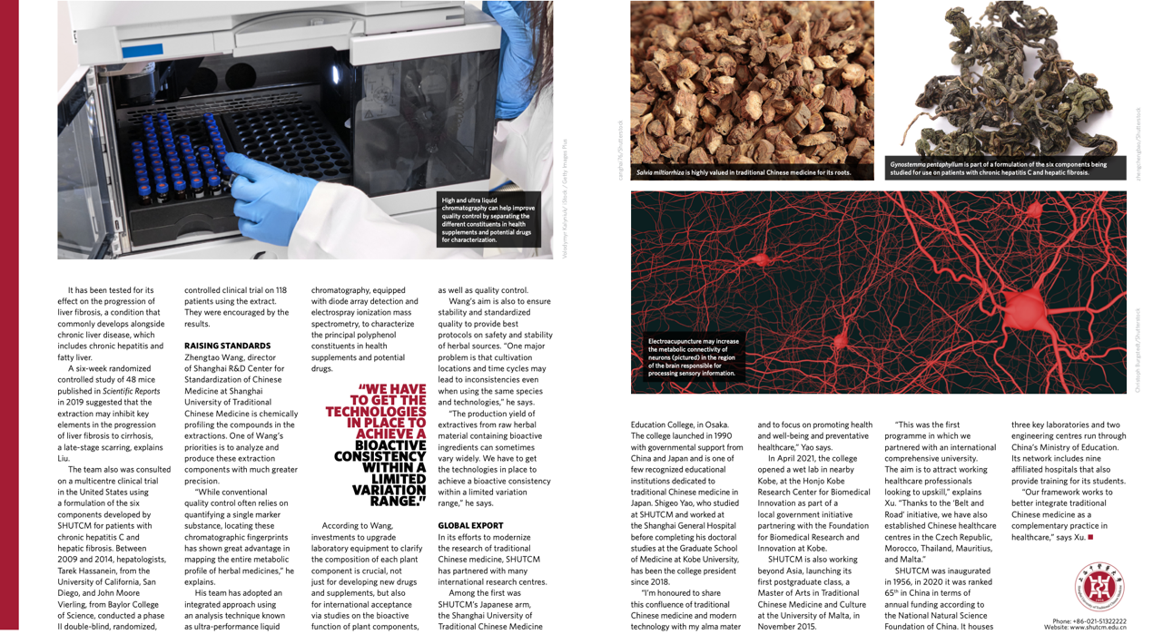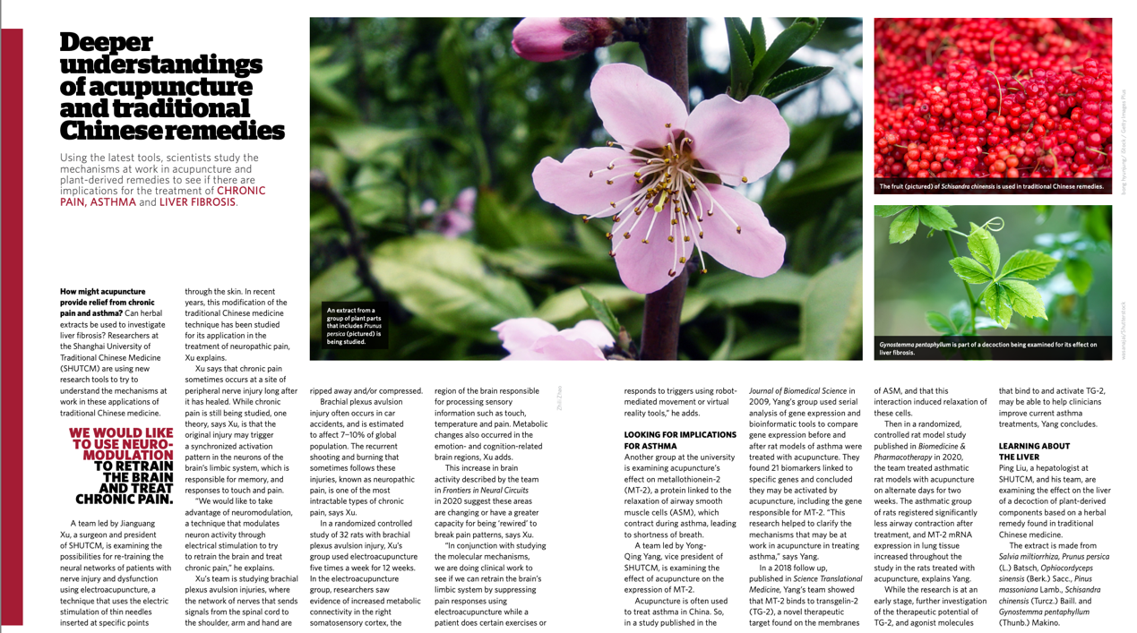 焦点关注特刊报道以“深度理解针灸与传统中医疗法”为主题,重点介绍了学校研究团队使用现代技术研究针灸和传统中医药疗法对治疗慢性疼痛、哮喘、肝纤维化以及提高中药标准等方面的研究成果。同时,介绍了学校开展国际交流,扩大国际影响的成果。