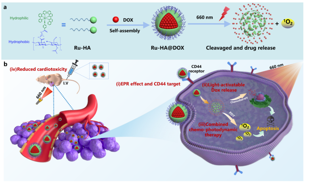 近年来,化疗、光疗及中药活性成分等联合治疗因其强效抗肿瘤作用备受关注。然而,如何实现联用药物的按需释放和减少毒副作用仍是抗癌药物研发和临床应用中的巨大挑战。针对该难题,课题组首次开发了一种具有光响应按需释药特性的两亲性材料Ru-HA,该材料由具有光裂解和光动力治疗能力(Photodynamic theraphy, PDT)的钌配合物(疏水端)与具有CD44受体靶向能力的生物相容性材料透明质酸HA(亲水端)构成。以临床阿霉素为模型药物,成功制备了多功能载药纳米制剂Ru-HA@DOX NPs,实现化疗-PDT协同抗肿瘤。