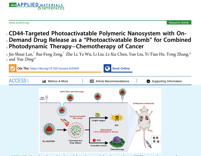 近日,我校中药学院张彤/丁越团队在国际期刊ACS Applied Materials & Interfaces上发文CD44-Targeted Photoactivatable Polymeric Nanosystem with On−Demand Drug Release as a Photoactivatable Bomb for Combined Photodynamic Therapy−Chemotherapy of Cancer,开发并报道了一种新型CD44靶向的光激活释放纳米递药系统用于化疗和光动力疗法协同抗肿瘤研究。该研究成果为癌症协同治疗提供了新的思路和方向,也为中药抗肿瘤活性成分的增效减毒抗肿瘤研究提供了有力工具。