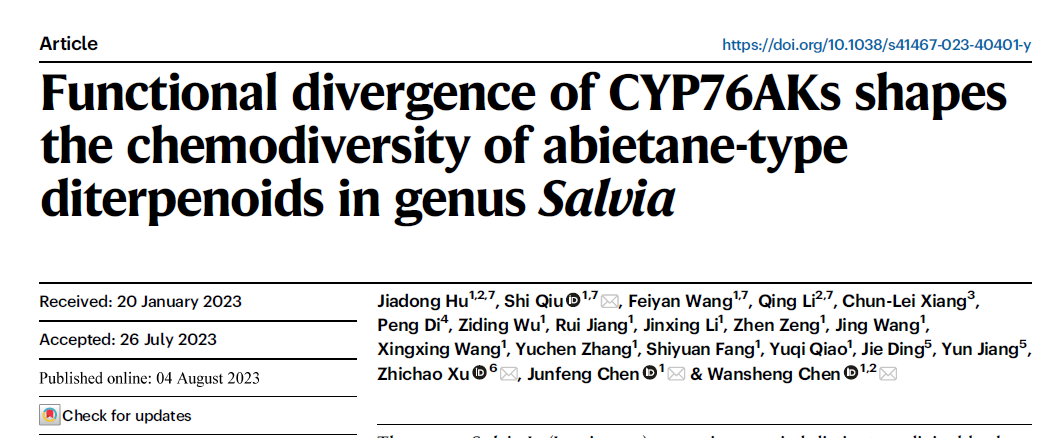 近日,我校中药研究所陈万生教授团队在Nature Communications发表题为Functional divergence of CYP76AKs shapes the chemodiversity of abietane-type diterpenoids in genus Salvia的研究论文。该研究提出了“以属内进化为视角”的多组学联合分析创新研究策略,阐明了鼠尾草属中松香烷型二萜类化学多样性的形成机制,发现催化酶基因功能缺失可作为天然产物结构多样化的驱动力。