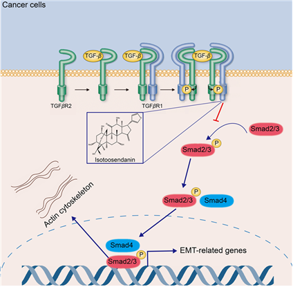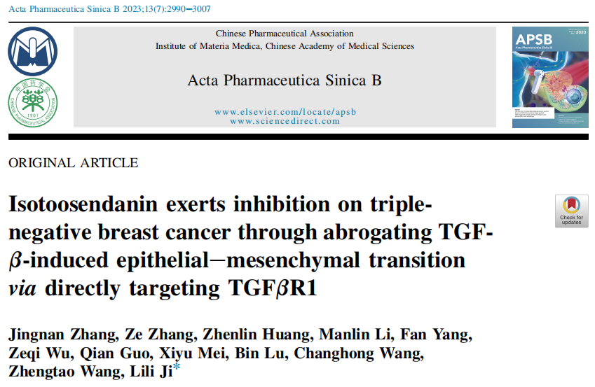 近日,我校中药研究所季莉莉研究员团队在Acta Pharmaceutica Sinica B发表题为Isotoosendanin exerts inhibition on triple-negative breast cancer through abrogating TGF-β-induced epithelial-mesenchymal transition via directly targeting TGFβR1的研究论文,揭示了中药川楝子中活性化合物异川楝素抑制三阴性乳腺癌转移的机制。